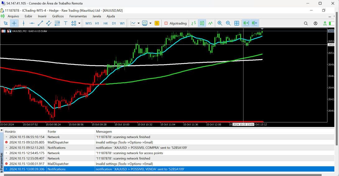 Ø Conforme imagem abaixo o indicador emitiu um notificação de VENDA as 13:00 totalmente fora das condições de venda. A única notificação que deveria haver hoje ocorreu as 09:52, uma notificação de COMPRA, essa foi enviada corretamente.