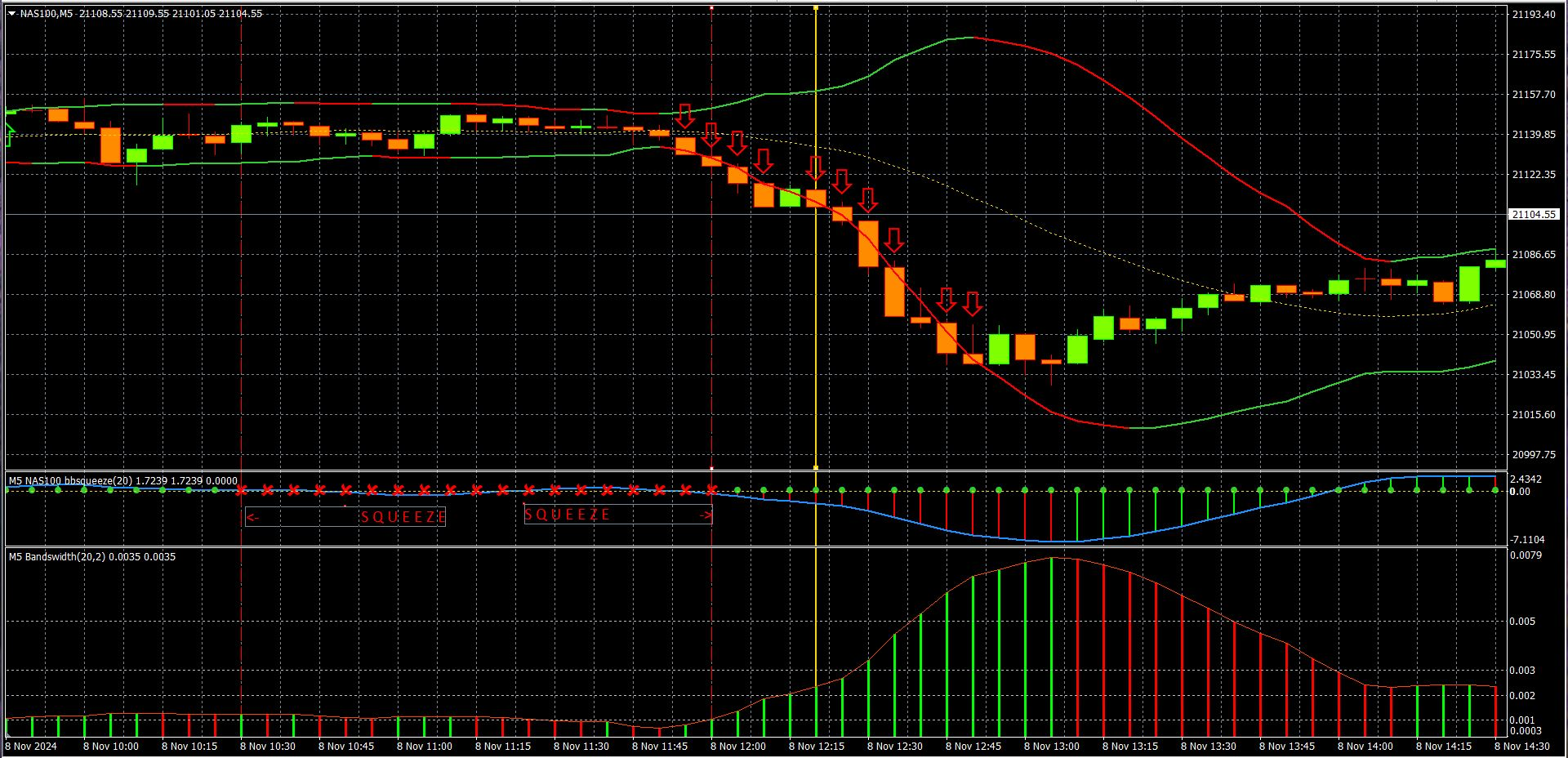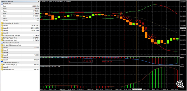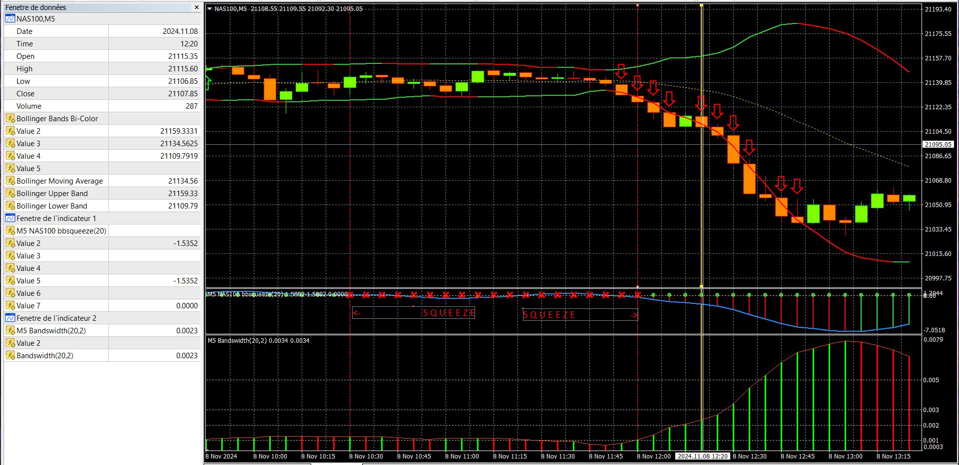 Exemple avec MT4 : Symbol NAS 100 en Time Frame M5 le 08/11/2024 à 12h20 (H VFX)