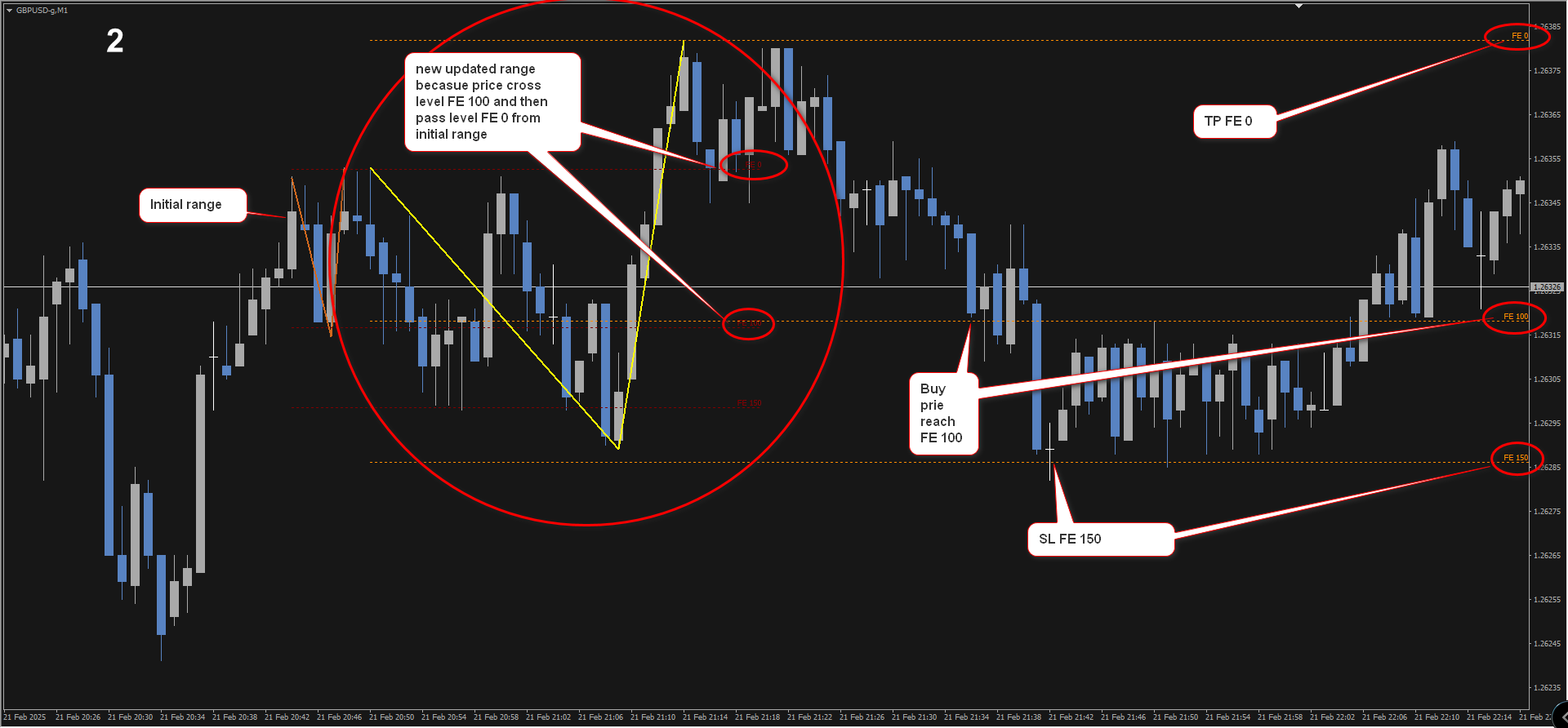 - A new trade will only be executed after the price breaks FE 0 and the range is updated accordingly.