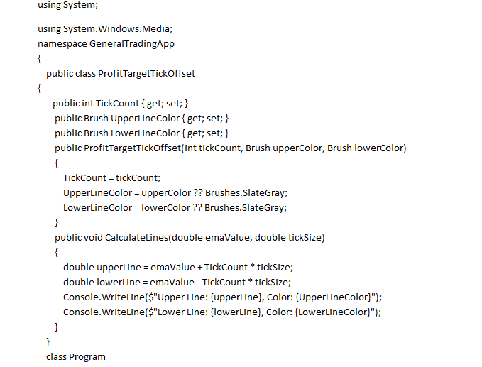 using System; using System.Windows.Media; namespace GeneralTradingApp { public class ProfitTargetTickOffset { public int TickCount { get; set; } public Brush UpperLineColor { get; set; } public Brush LowerLineColor { get; set; } public ProfitTargetTickOffset(int tickCount, Brush upperColor, Brush lowerColor) { TickCount = tickCount; UpperLineColor = upperColor ?? Brushes.SlateGray; LowerLineColor = lowerColor ?? Brushes.SlateGray; } public void CalculateLines(double emaValue, double tickSize) { double upperLine = emaValue + TickCount * tickSize; double lowerLine = emaValue - TickCount * tickSize; Console.WriteLine($"Upper Line: {upperLine}, Color: {UpperLineColor}"); Console.WriteLine($"Lower Line: {lowerLine}, Color: {LowerLineColor}"); } } class Program { static void Main() { // Example usage ProfitTargetTickOffset offset = new ProfitTargetTickOffset(24, Brushes.Blue, Brushes.Red); double exampleEMAValue = 1200.5; // Replace with actual logic for EMA calculation double tickSize = 0.01; // Replace with actual tick size offset.CalculateLines(exampleEMAValue, tickSize); } } }