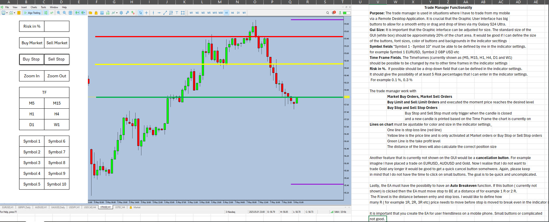 The Trade manager should be used in situations where I have to trade from my mobile phone via a Remote Desktop App. It is crucial that the Graphic User Interface as shown in the specifications file has