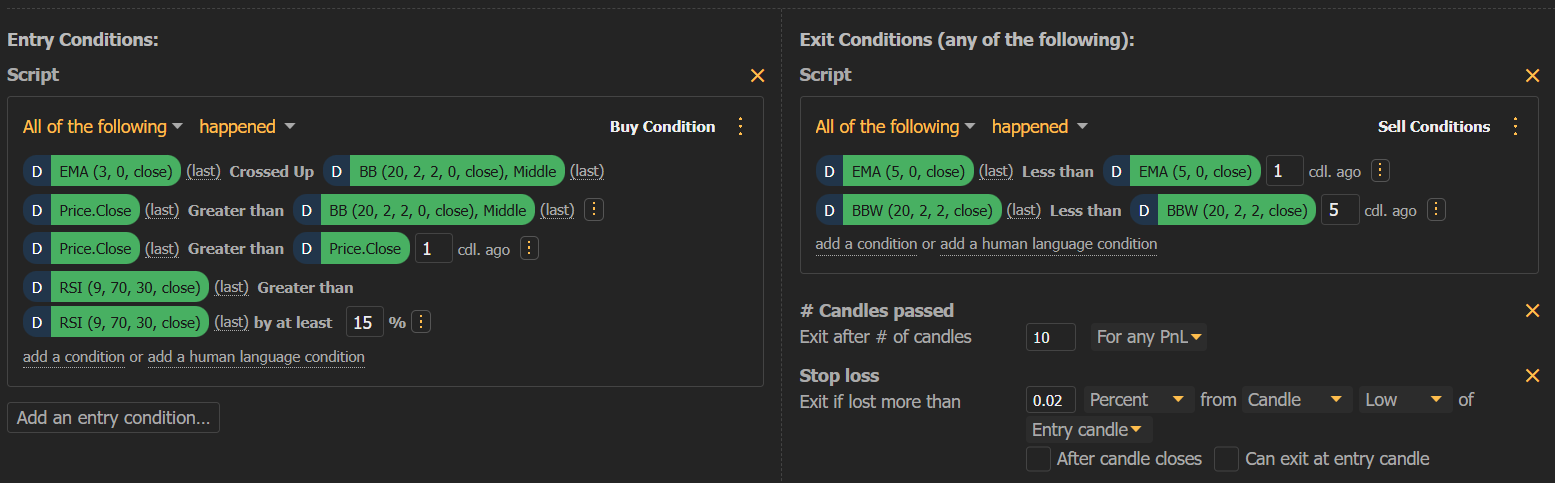 TrendSpider enables visual, no-code strategy creation using technical conditions. Once entry or exit conditions are met, trades are triggered at the open of the following bar (for entries) and exited at the close of the following bar (for exits).