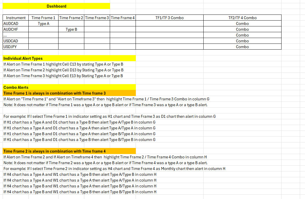 - Dashboard needs to monitor all instruments that are currently on MT5's market watch list (automatic). It also must have the option to manually enter instrument sin the indicator settings