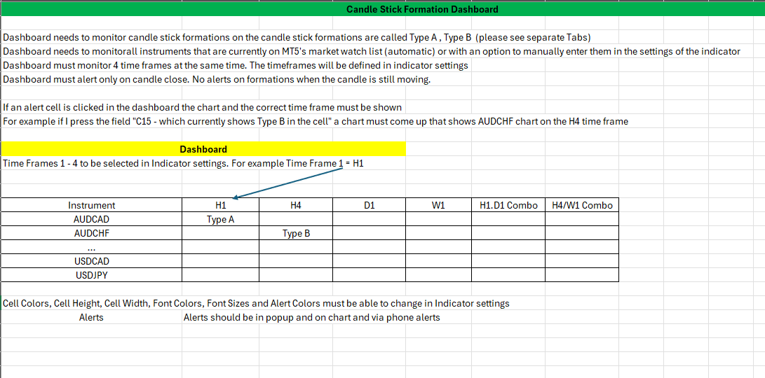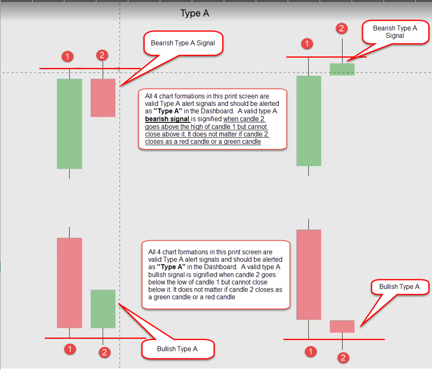 - 2 different candle stick formations called Type A , Type B. For a precise explanation and chart examples please see attached file (please see separate Tabs)