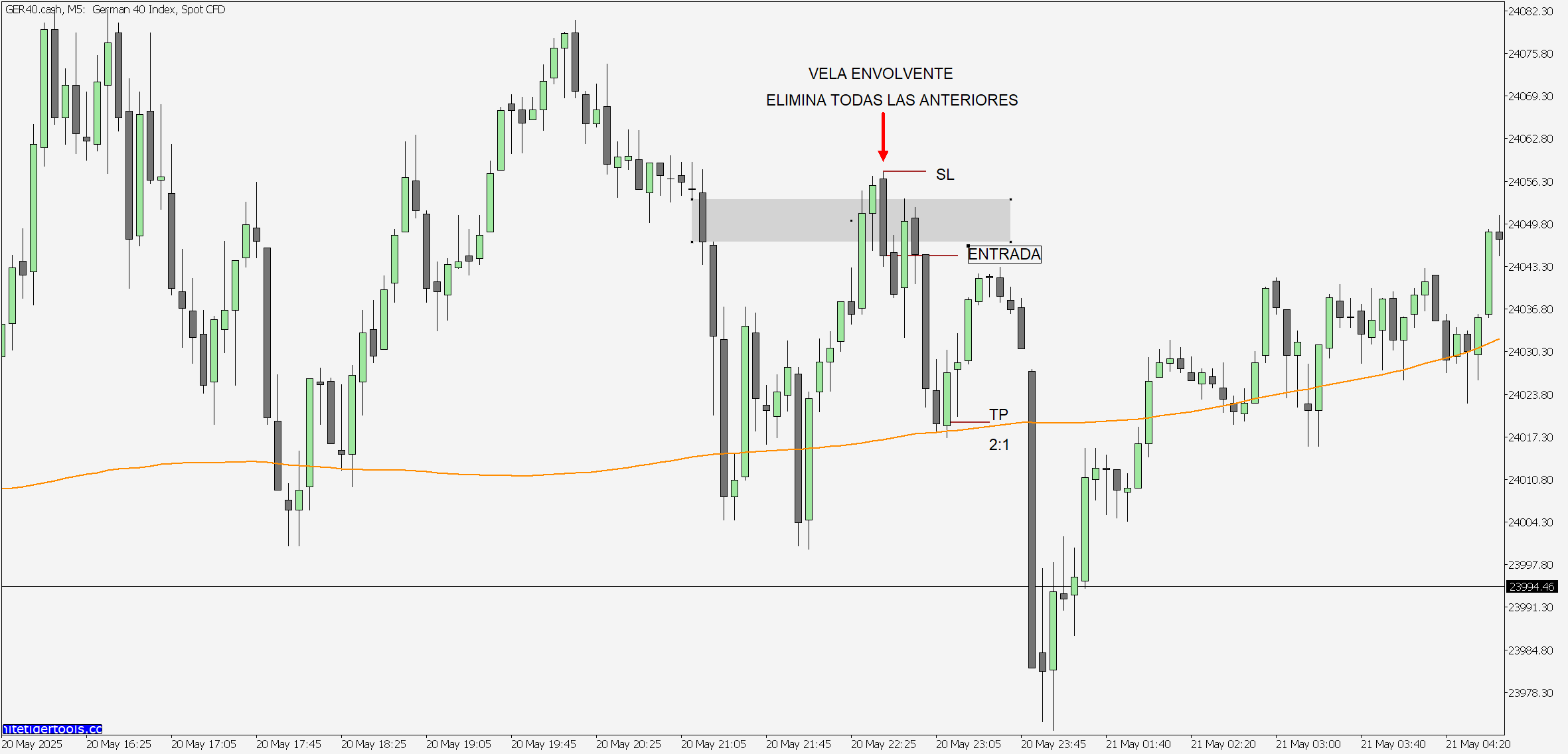Gestión de riesgo inteligente, colocando el Stop Loss en el mínimo de la vela de cola o envolvente en el caso de compra y el Take Profit con una relación 2:1 respecto al riesgo.