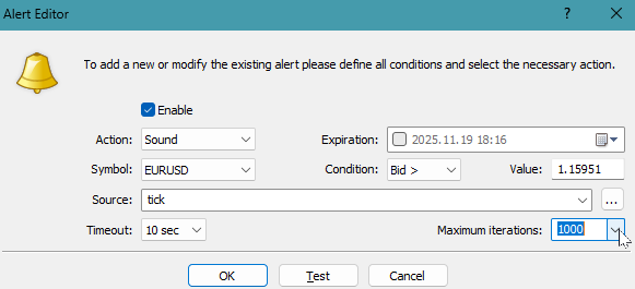 · The action notifications shall be initiated only after x number of consecutive ticks. (this option is not part of the Alerts Tab in MT4)