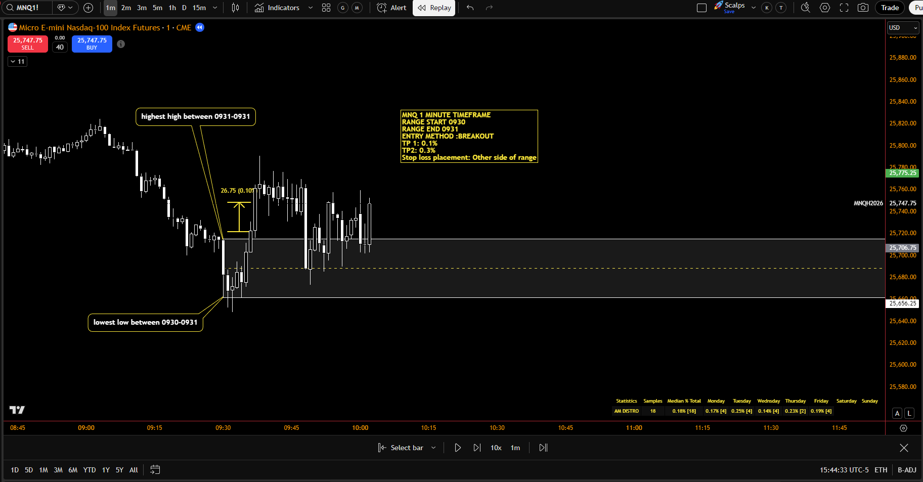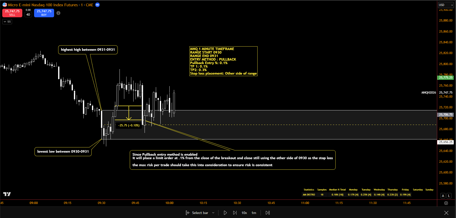• Trades and range drawn on chart for review