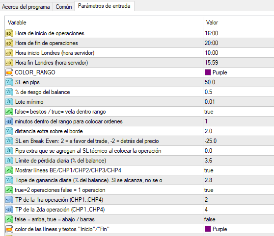 Tanto el rango de Londres como las líneas de los checkpoints mencionados deben marcarse visualmente en metatrader, como si fueran un indicador. Adjunto una imagen de los valores configurables que tendría el bot