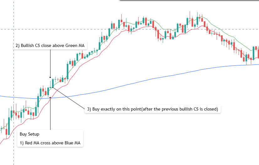 - For buy setup, red MA must close above blue MA. Bullish candlestick must close above green MA.