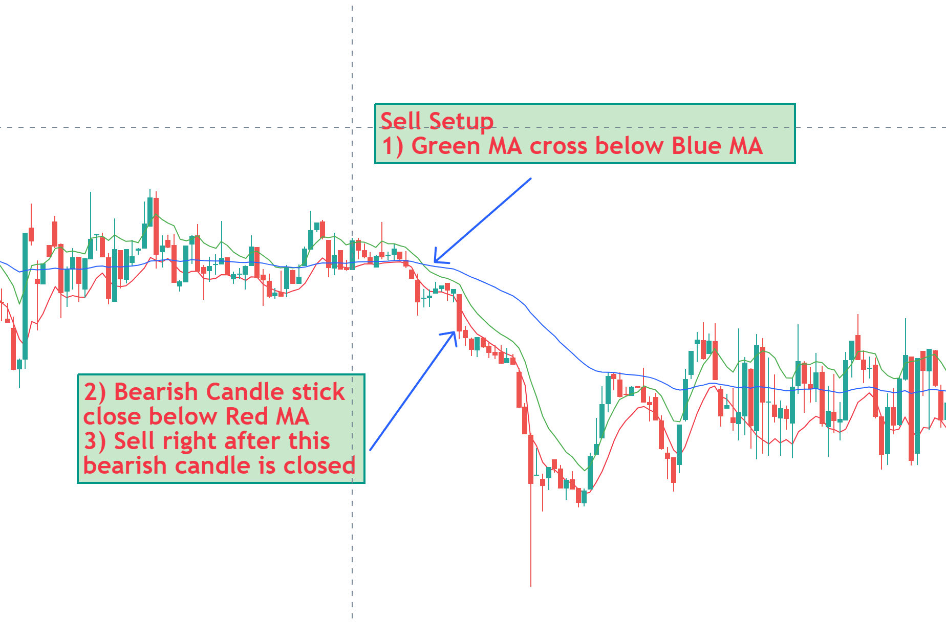 - For sell setup, green MA must close below blue MA. Bearish candlestick must close below red MA.