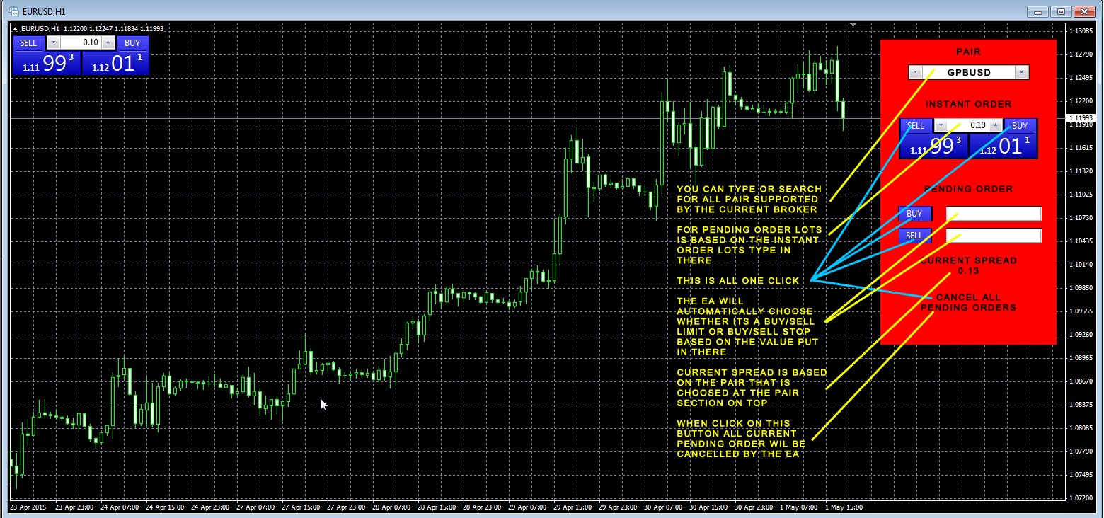 This EA will also come with a panel at the chart like the (one click trading panel). This panel have the function of open an instant order and pending order. there will be a list of all the pairs in the panel so we can choose which pair we want to trade using a search bar in the panel for easier searching of pairs. so we dont need to load the EA (with the panel) to every chart (only need to load the EA to one chart only). i will send image of how the panel and the EA setting looks like for easier understanding. the panel also will be installed with cancel all order script.
