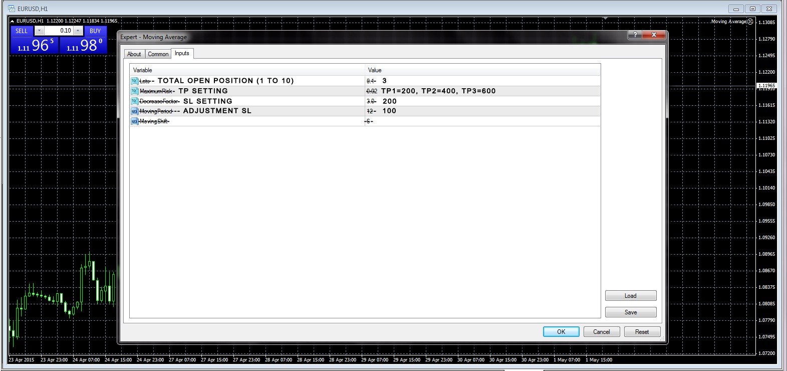 Then if TP1 is hit at 1.20200, the 1st order (order A) will be close. and the EA will automatically readjust the SL for the remaining two order (order B and C) to new SL value of 100point(based on value setting of adjustment SL) that is ORDER B SL= 1.20100 and order C SL=1.20100.