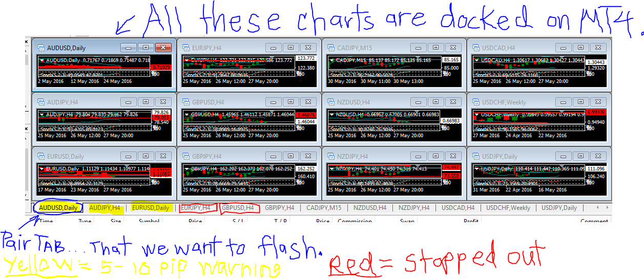 Flashing Signals... I would prefer for the Pair's TAB to Flash RED or, YELLOW... YELLOW if the PAIR is within 5 pips of getting STOPPED OUT... And RED when the PAIR has already gotten STOPPED OUT UNTIL CLICKED. But, if this is not possible, possibly the screen could DOCK to the Main Platform Window and Flash until clicked (IN ARRANGE WINDOW TILE form)