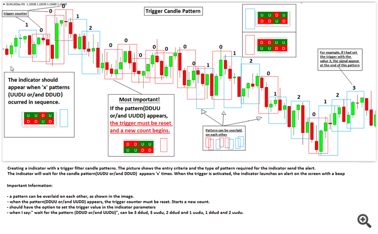 The indicator will wait for the candle pattern(UUDU or/and DDUD) appears 'x' times. When the trigger is activated, the indicator launches an alert on the screen with a beep