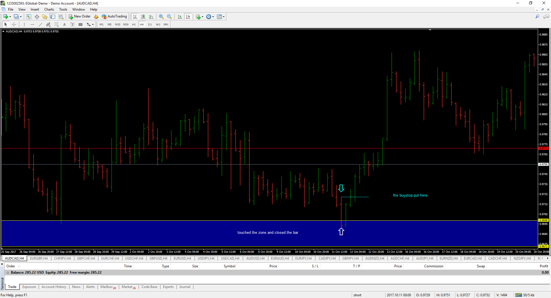 2. When the zone is done. I wait until the price has touched the zone and closed the bar. That bar which has touched the zone. I want to put a buy stop order on that bar’s high.