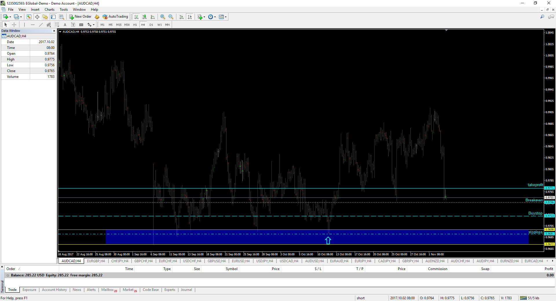 3. I am going to put out my take profit line myself, but between my order and take profit line I want my break even line to be. So, when the price has reached BE line my stop-loss move to my order. When the order starts my stop-loss starts on swing low. If the price hits Stop-loss replace the order again.