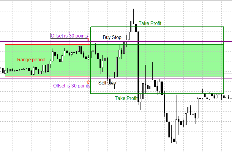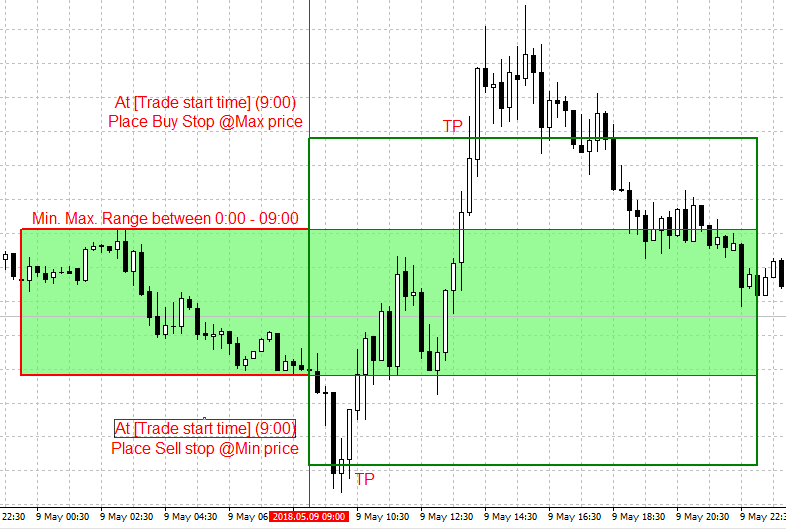 At a given time (Trading start time) the EA will check the min and max amount at the given time period. Then it places 2 buy stop and 2 sell stop orders at the minimum and maximum price.