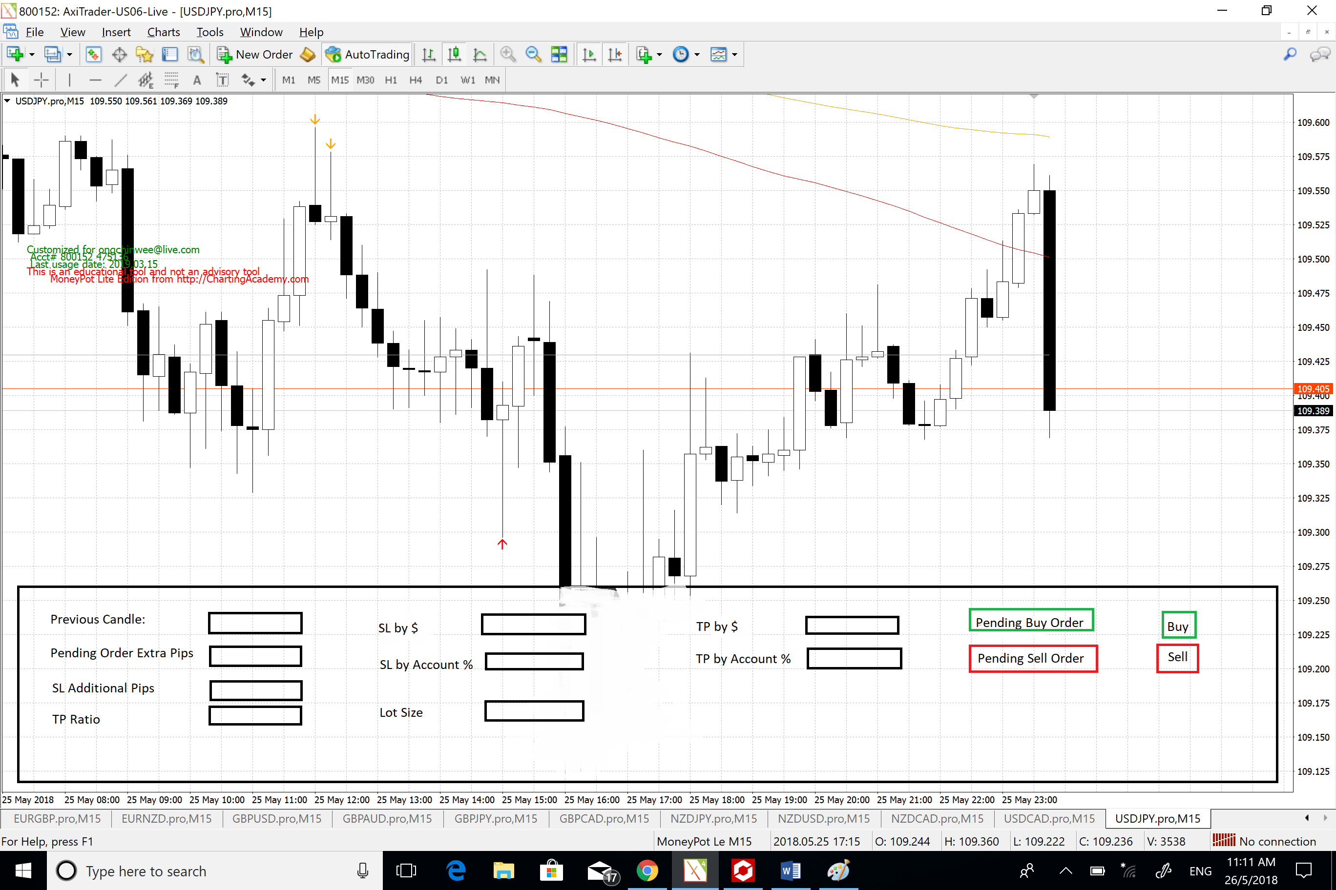 The pending buy is Value of “Previous candle” ‘s low + “Pending Order Extra