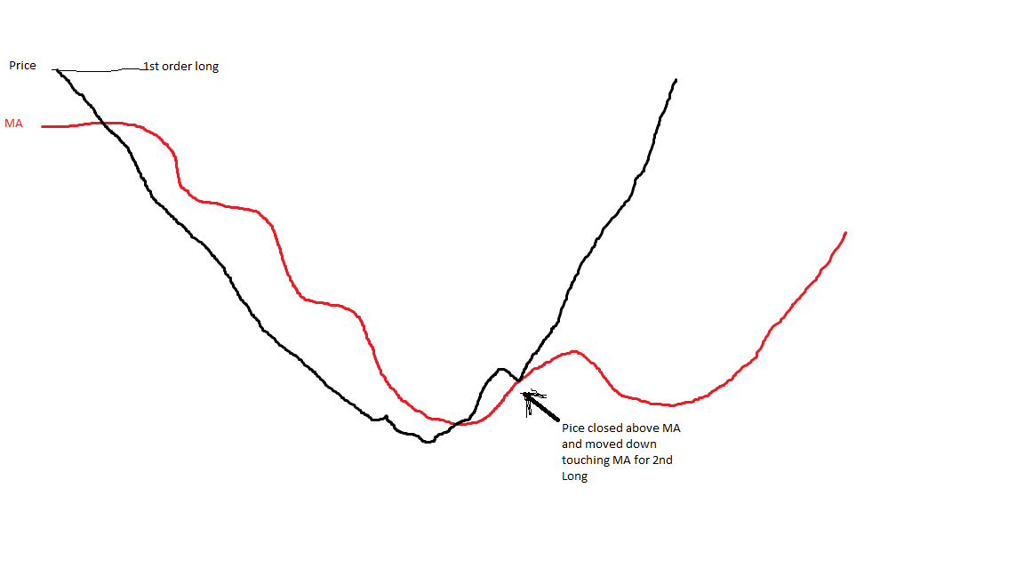 Moving average (MA) filter inputs/parameters and Explanation: This is a filter for the grid input. Long scenario: So, if MA filter is on, when/if 2nd trade has met the required grid distance, price must be below Grid and 2nd order not to open until price has moved above moving average, then bar close, and then price pulls back down to touch back to moving average then 2nd order can open. Grid distance must be maintained by the grid input setting Vice Versa for short. See picture below