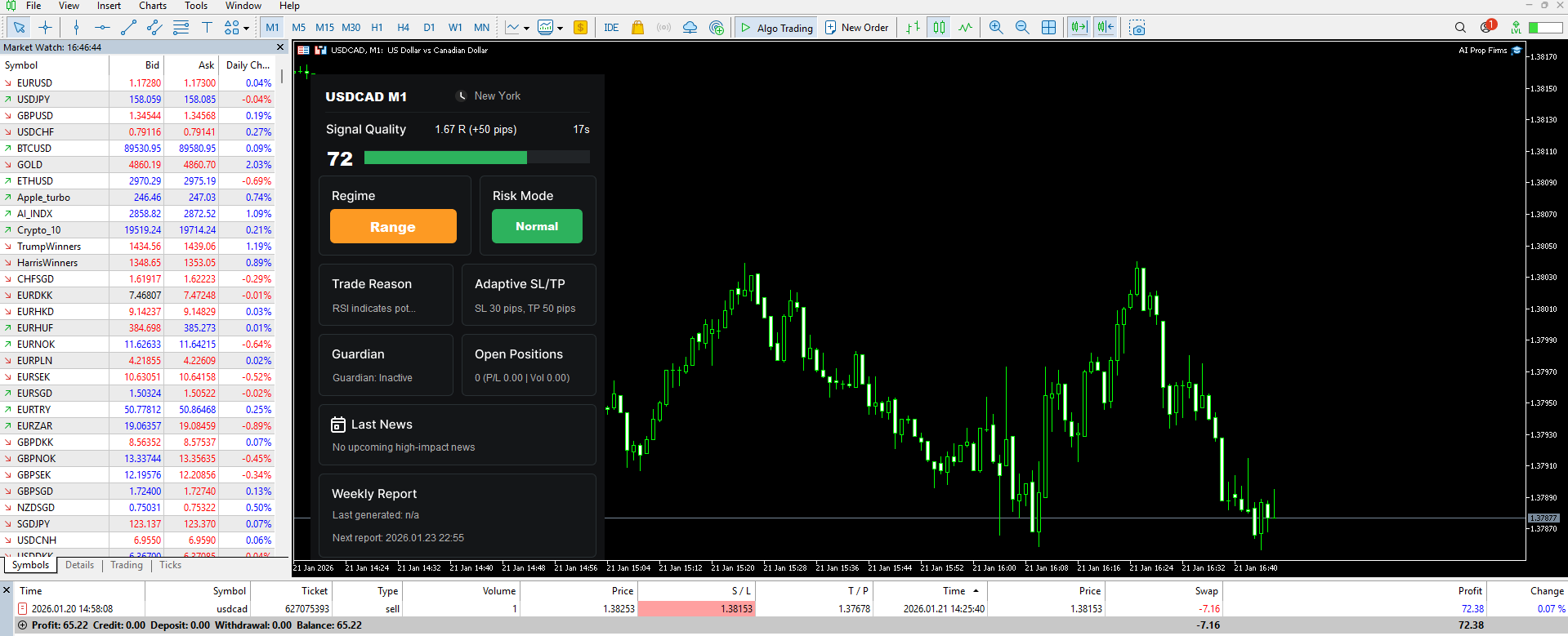 AI Prop Firms - Intelligent Automation Built for Prop Trading Firms. AI Prop Firms is an advanced fully automated Forex trading system powered by Artificial Intelligence, developed specifically to operate within the strict rules and evaluation models of prop trading firms. The system is designed to trade under controlled risk conditions while maintaining consistency, stability, and compliance with prop firm requirements. AI Prop Firms uses intelligent market analysis logic that continuously evaluates price behavior, volatility, and liquidity conditions, adapting its execution in real time. The strategy focuses on precision based entries, smart timing diversification, and strict capital protection rather than aggressive exposure. The system does not use martingale, grid, or high risk recovery techniques, making it suitable for long term prop firm trading. The core architecture includes advanced execution control features such as Entry Time Offset, which helps prevent synchronized trading across multiple accounts, and a Daily Drawdown Guard that automatically protects accounts from breaching daily loss limits. All trading decisions are executed automatically in real time and managed by Artificial Intelligence, which continuously analyzes market conditions and applies adaptive risk parameters. AI Prop Firms is currently optimized for the USD/CAD pair, where the strategy is tuned for stable performance under prop firm conditions. New pair GBP/USD will be added in an upcoming update, within 5 days. The system can be used both during evaluation challenges and on funded accounts, and it works with any Forex broker that supports MetaTrader.The system generates concise weekly performance summaries, highlighting key statistics and insights to help users monitor behavior and consistency.
