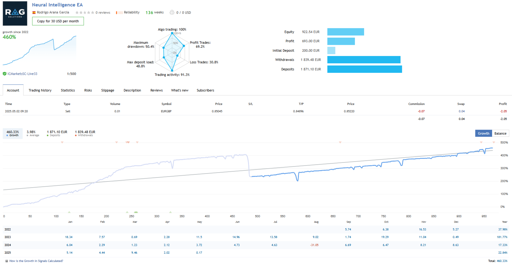 Neural Intelligence has been created to grow people's capital in a simple and accessible way. If you are tired of algorithms that seem to work great in backtesting but then don't work the same in live accounts, then Neural Intelligence is the solution you are looking for.