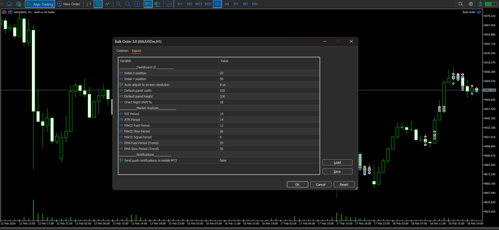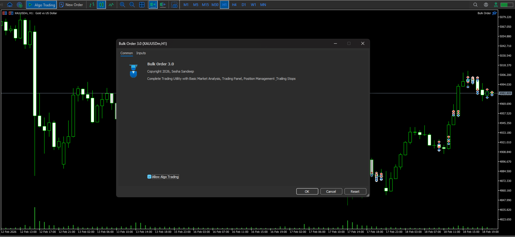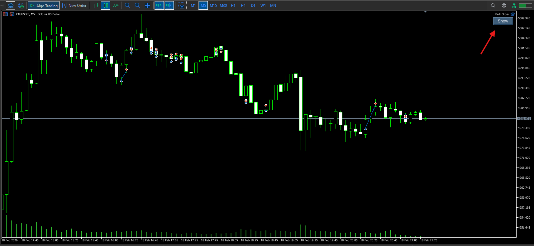 Bulk Order is a manual trading panel (Expert Advisor) for MetaTrader 5. It allows users to execute orders directly from the chart.