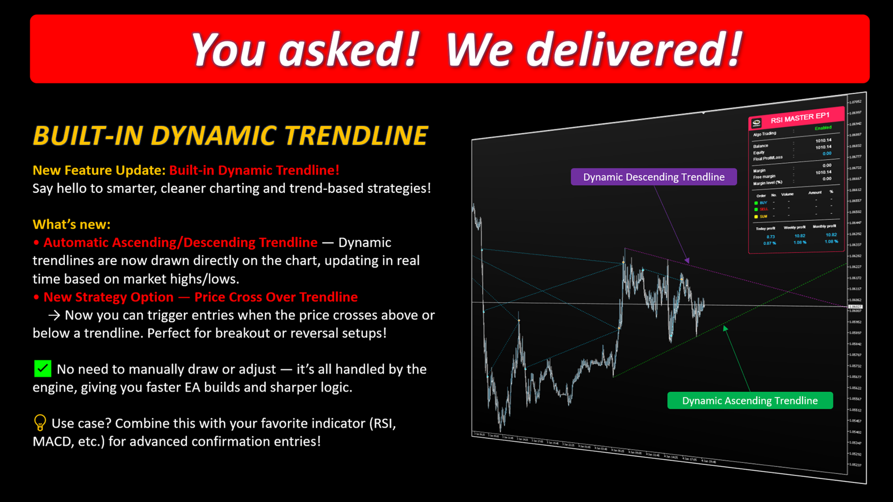 • Automatic Ascending/Descending Trendline — Dynamic trendlines are now drawn directly on the chart, updating in real time based on market highs/lows.