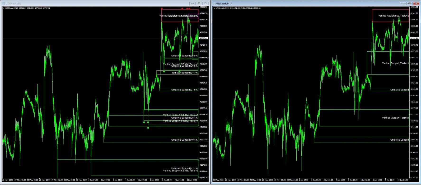 - Test point markers showing where price tested each zone