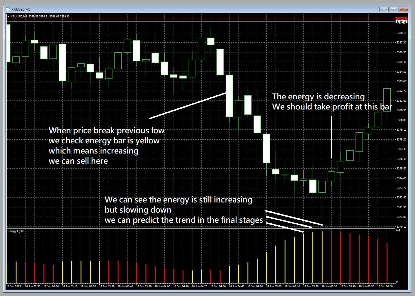 EnergyX is a unique tool that visualizes the "energy" of the market in a separate window. It helps you quickly see when energy is rising or falling, making it easier to spot potential trading opportunities.