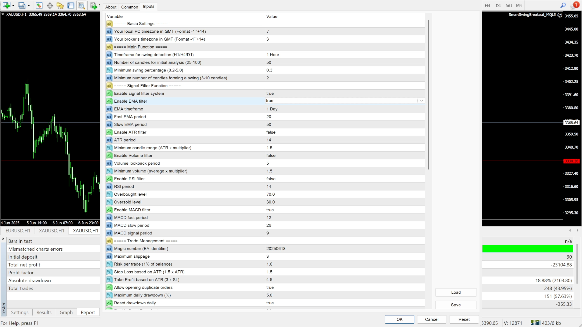 When price breaks above/below swing levels, the EA checks for volume, ATR, RSI, MACD, and EMA filters (optional). -