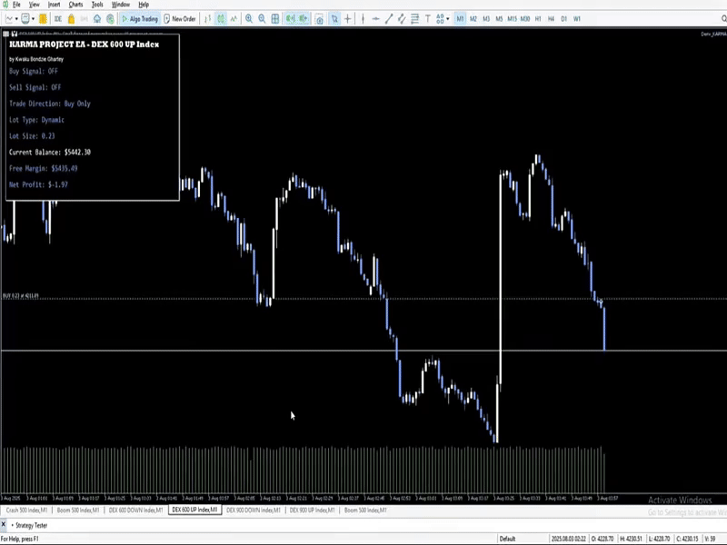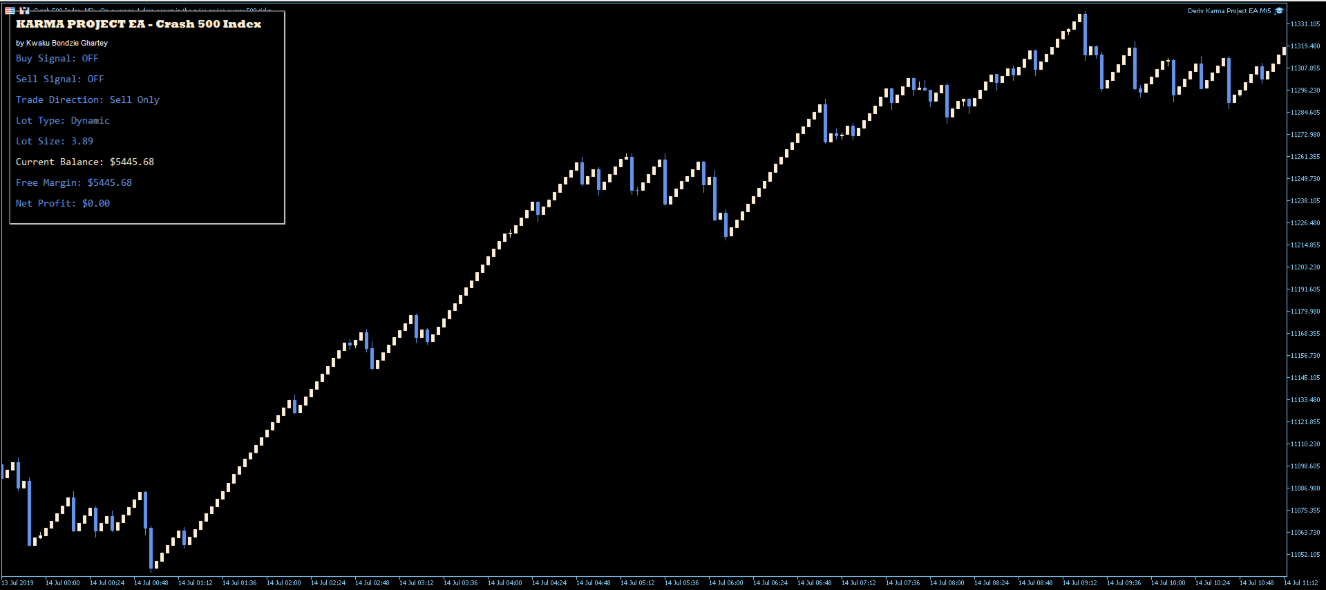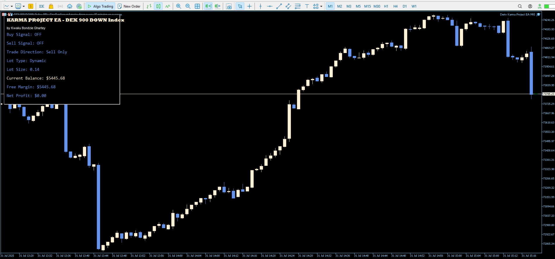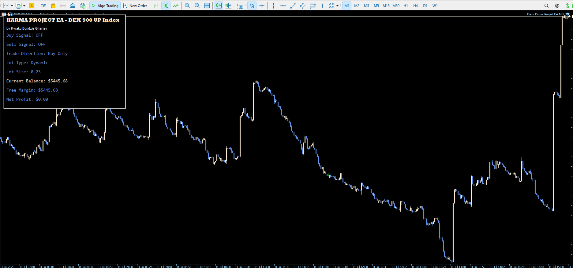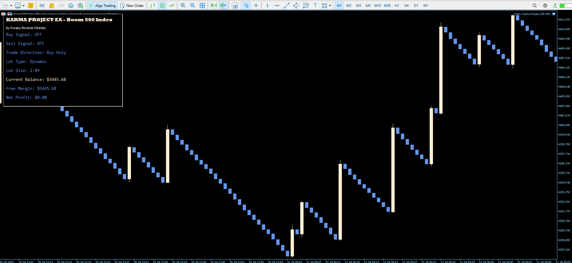 The development of Karma Project EA began after several years of trading synthetic indices and studying various recovery-based strategies. The focus was on creating a system that balances trade frequency with risk control, using technical indicators that respond well to the unique characteristics of Deriv instruments.