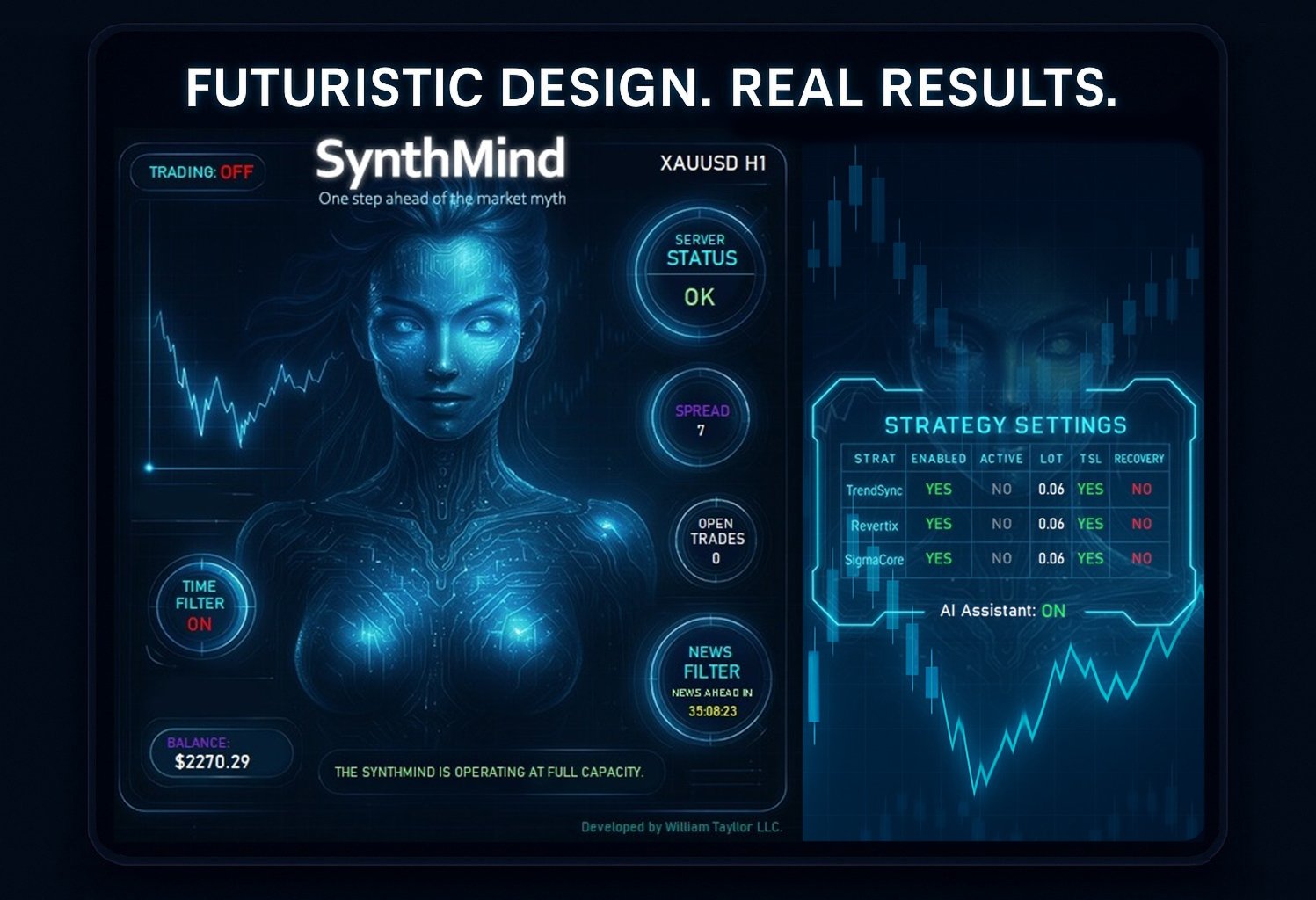 SynthMind unifies image-based pattern recognition, institutional flow monitoring, and volatility filtering into a single Expert Advisor for automated trading on MetaTrader 5. SynthMind processes real‑time chart images and multi‑timeframe pattern recognition to spot market turning points before they happen. It’s simply a revolution in algorithmic trading.