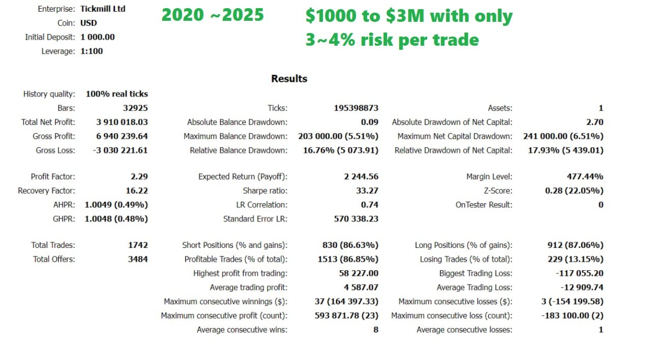 Preliminary Review - i have just gotten the EA so i cant speak about its performance on real acc at thi point. But: 1) Developer is very communicative and open, helpfull reacts fast 2) Questions are awnsered honestly and fast 3) Backtest look good but not crazy unbelieveable 3) author said live signal and buyers group will follow - green flags! 4) R:R is realistic and fine (3:1) for an EA . I will update within a month with actual live performance data.