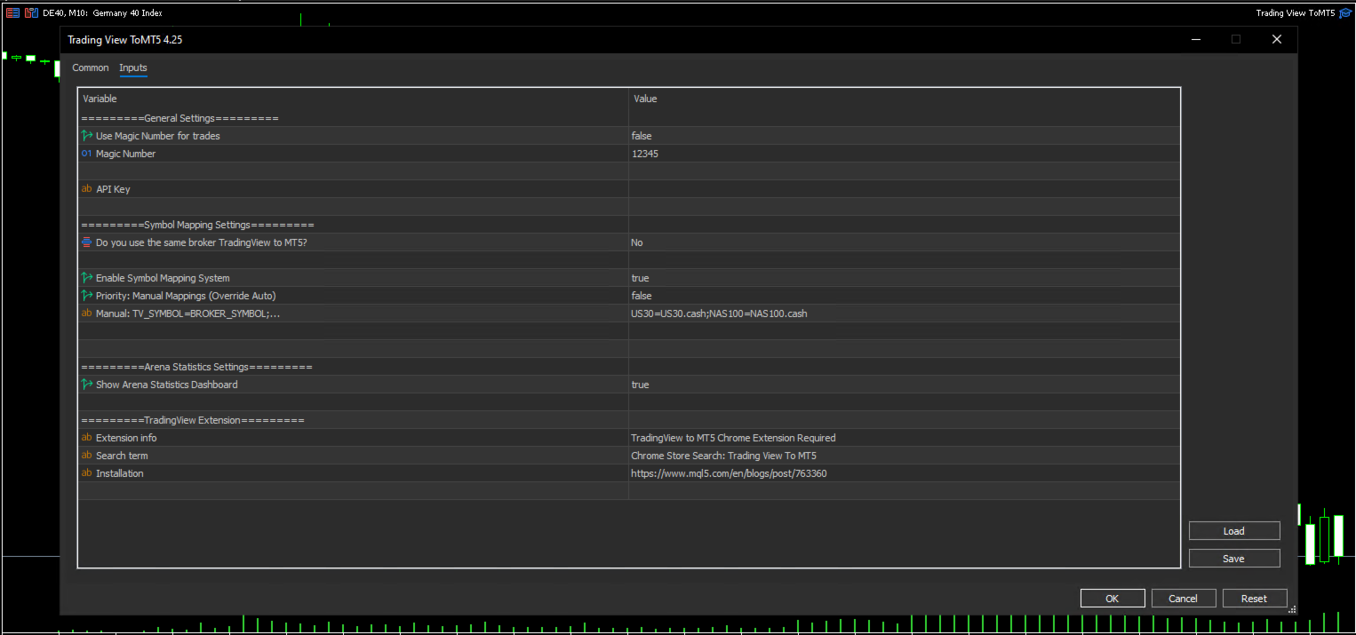 Configure: Set your unique API Key in both the EA and the extension. Configure your symbol mapping and risk parameters in the EA's input settings.