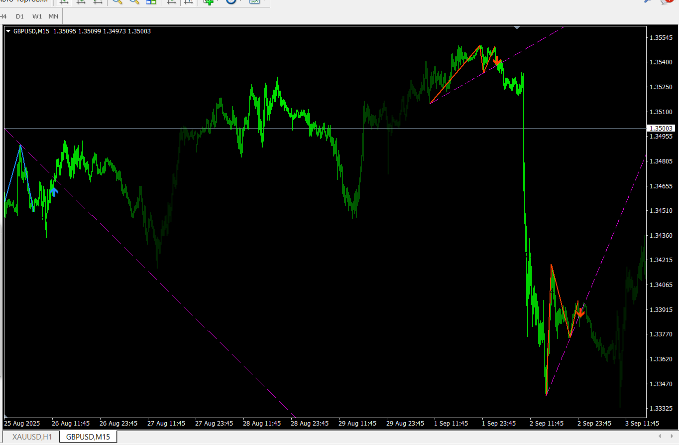 Как работает? Прежде чем даже начать искать сигнал на вашем графике (например, M15), этот фильтр смотрит на старший таймфрейм (например, H1 или H4). Он определяет, кто сейчас главный на рынке — быки или медведи, анализируя структуру максимумов и минимумов.