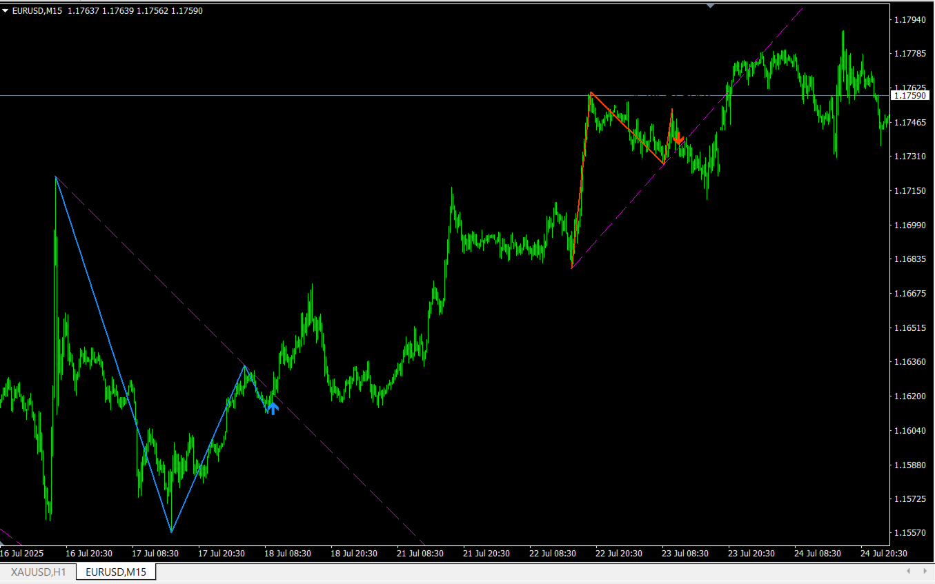 Как работает? 99% индикаторов кричат "Покупай!" в момент пробоя трендовой линии. Наш индикатор умнее. Он ждет, когда цена после пробоя вернется назад, чтобы "поцеловать" линию снаружи. Это и есть ретест — классическое подтверждение истинности пробоя.