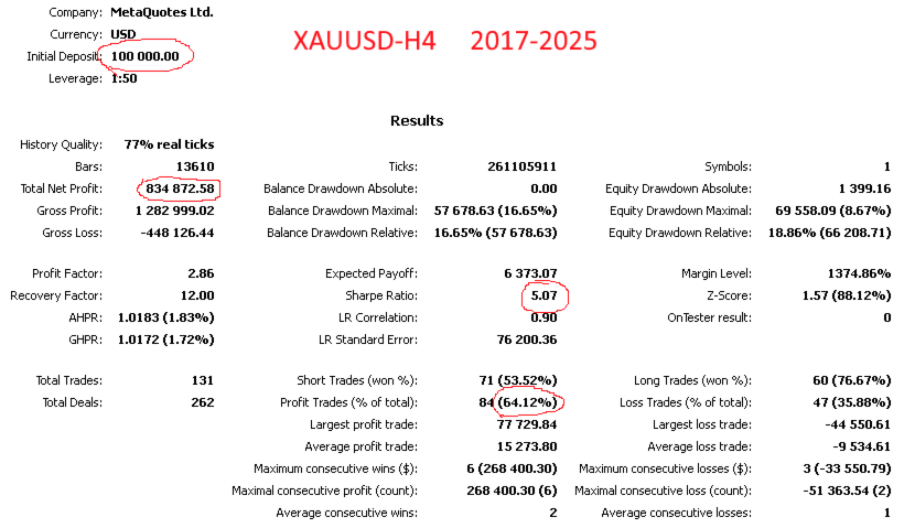 Volatility Filter: The expert advisor has a built-in additional filter based on ATR (AtrFilterPeriod). Trading is permitted only if the current market volatility exceeds a set threshold, which helps to avoid periods of low activity.