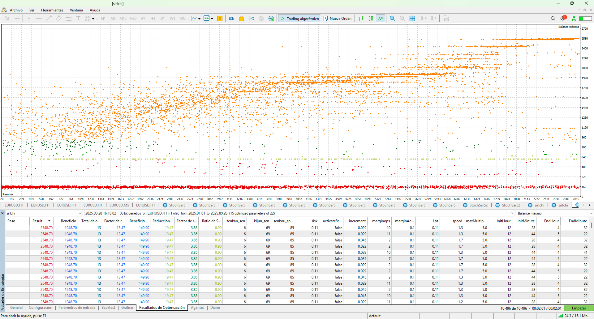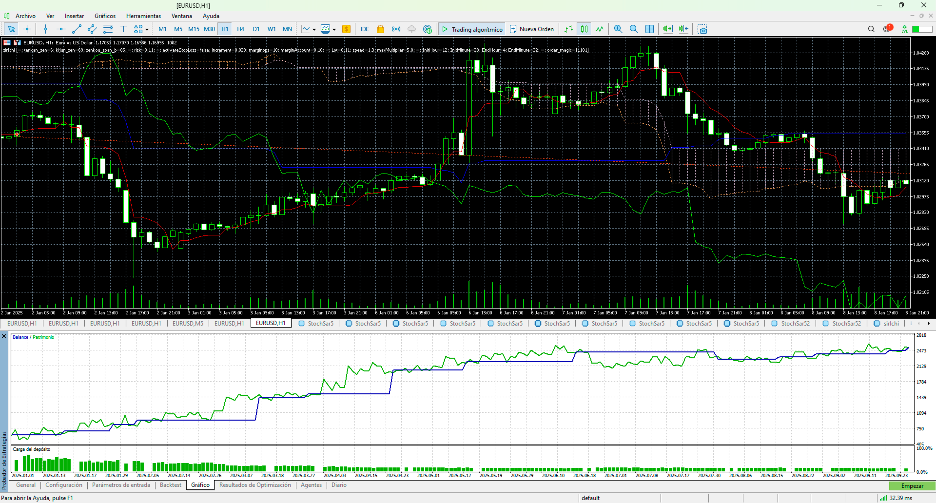 Trend-following Expert Advisor that acts based on Ichimoku indicators, programmed to respond for identify strong trend moments and ensure greater precision in entry decisions for better perfomance in ops. It features optional stop-loss control based on the percentage of price change, or "stop and reverse" between these moments, and lot scaling based on balance growth.