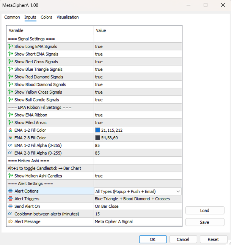 Market Cipher A is traditionally used with Heiken Ashi candles for smoother trend reading and cleaner signal interpretation. Meta Cipher A has built in Heiken Ashi support. Simply toggle it on in the settings and the indicator will render authentic HA candles with customisable colours.