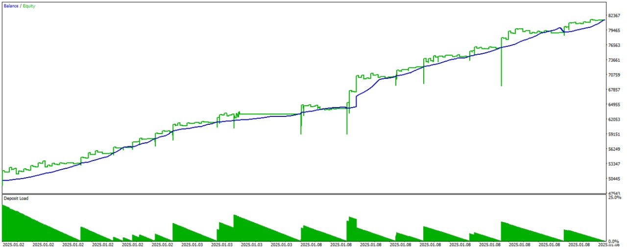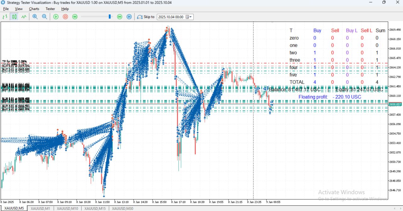 The EA waits for a pullback and opens multiple Buy positions during upward movements of Gold.