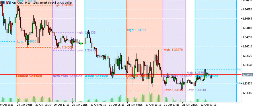 Instantly highlights the Asian, London, and New York sessions on your chart using color-coded vertical lines, giving you a clean visual view of session structure.