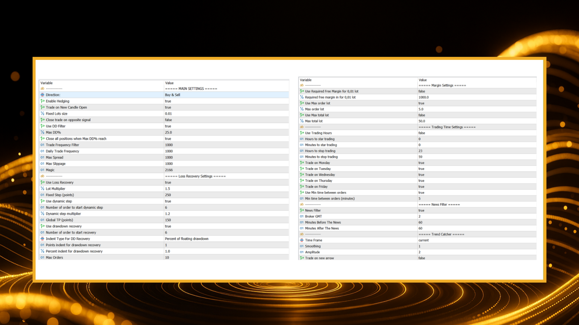 Max DD% and Loss Recovery filters to limit exposure automatically.