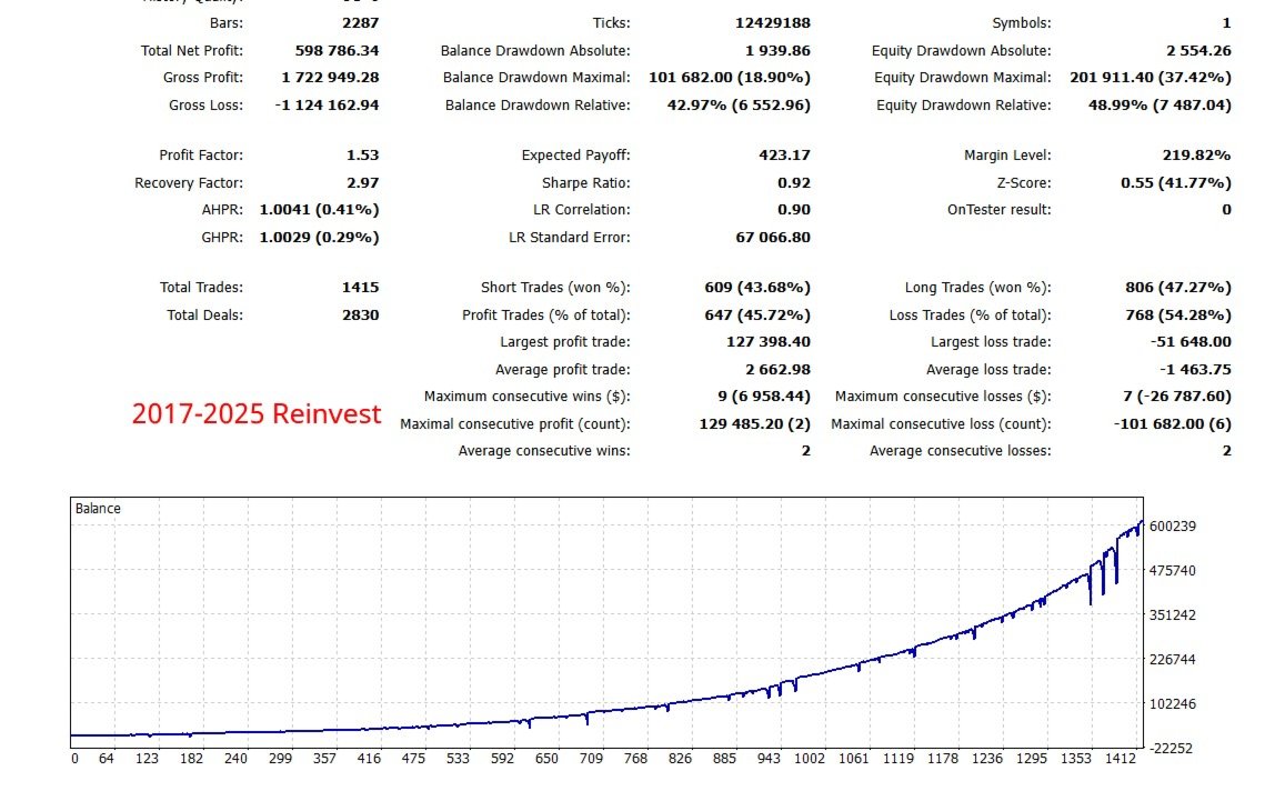 Показанные бэктесты (например, на скриншотах) оптимизированы для поиска наилучших параметров, но поэтому результаты не могут быть перенесены в реальную торговлю.