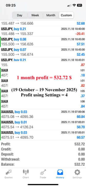 This is a Multi Currency Forex Robot and it executes trades for all supported pairs from 1 chart. After lot of research and live test with several broker and settings, this version is released. This version is only for limited clients. Future updated version will be given only to existing buyer of this EA and for institutional clients; so get it now. This Forex robot is developed as a passive income forex robot; which means every month to get some extra money.
