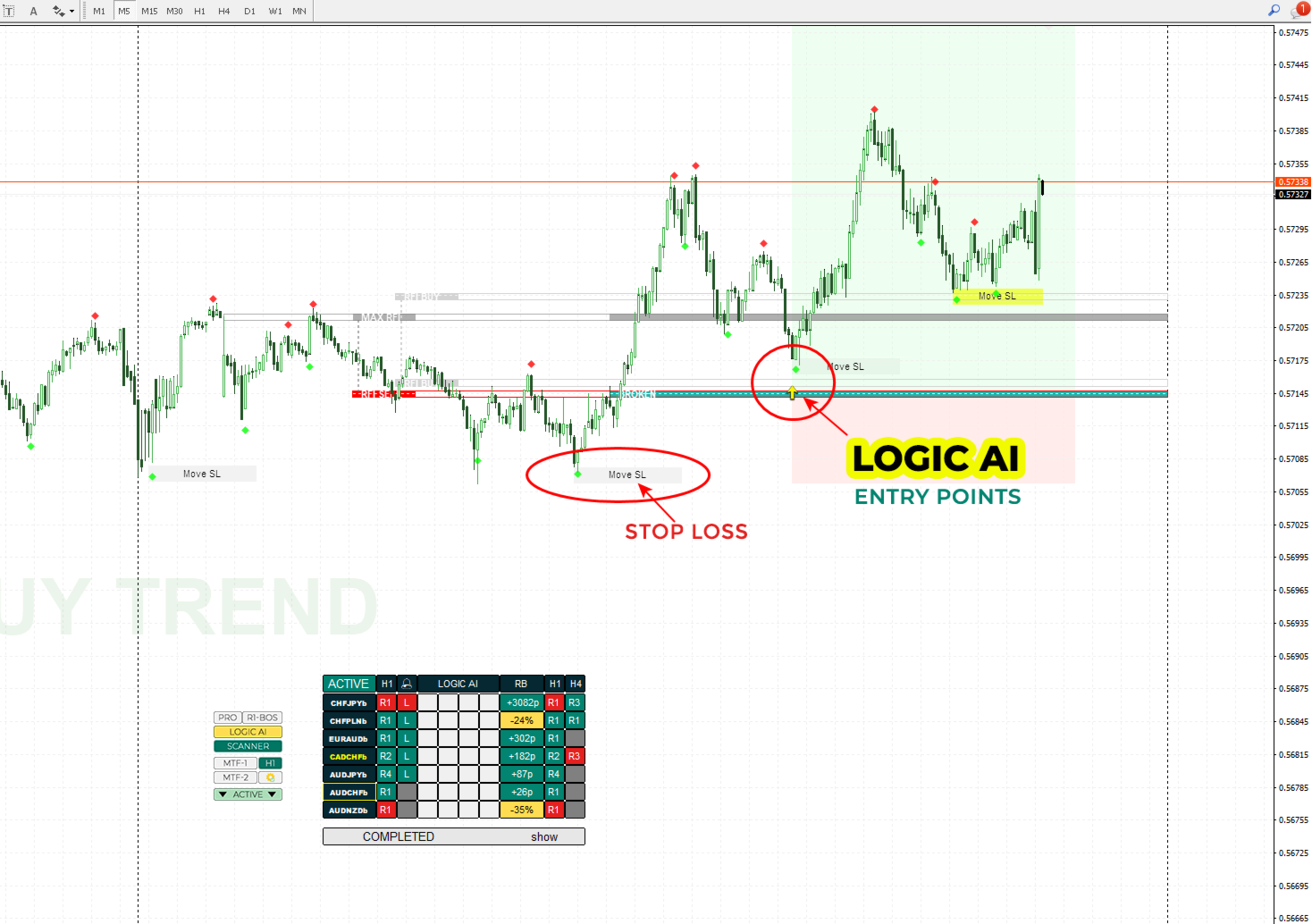 The system automatically analyzes trend direction, identifies reversal points and key market structures, helping traders pinpoint entry points with LOGIC AI.