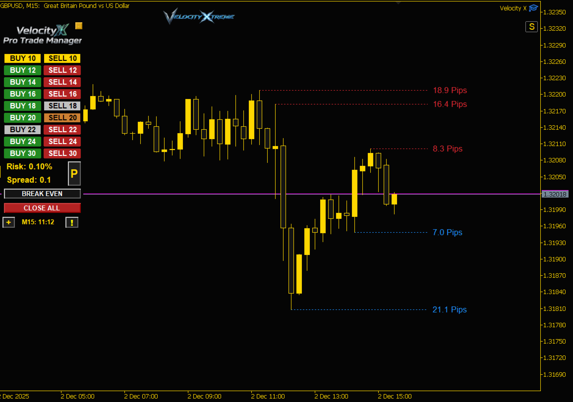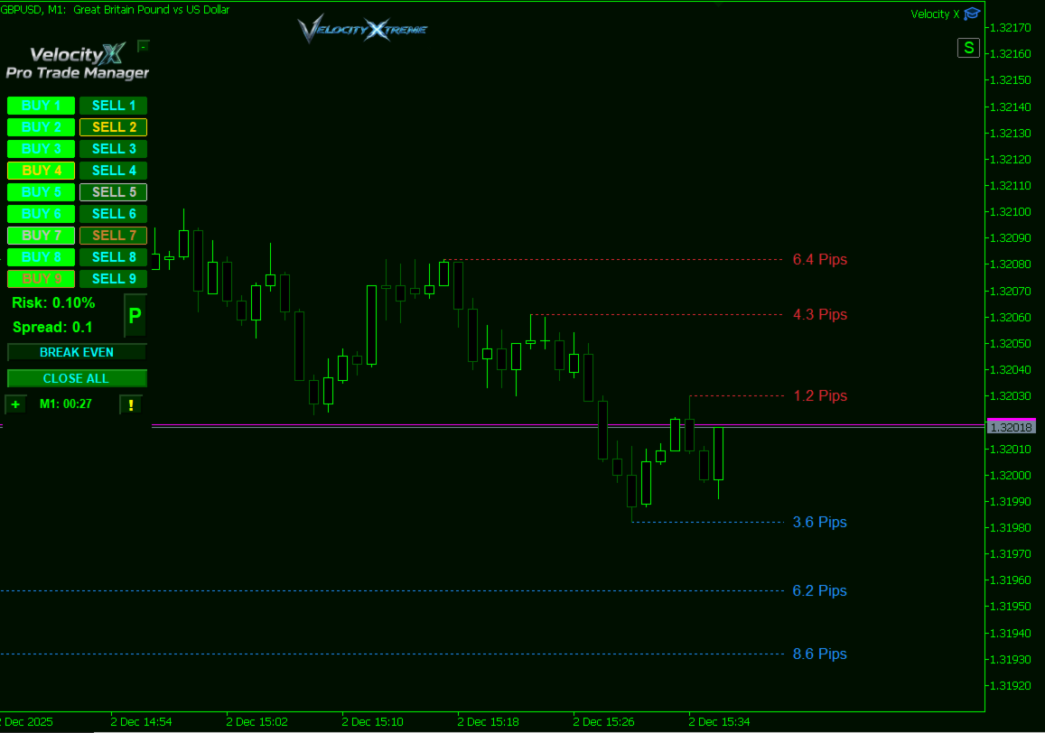 IMPORTANT DISCLAIMER: VelocityX is a Manual Trading Utility, not an automated trading robot. It executes trades only when you click a button. While the risk calculator is mathematically precise based on your inputs, you remain solely responsible for the risk percentage you select and the trades you take. Always test on a Demo account first to familiarize yourself with the buttons.
