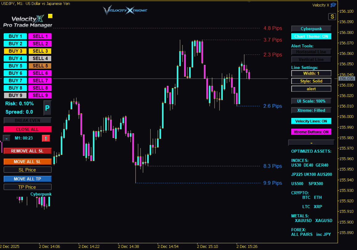 VelocityX features an Asset Detection Engine that automatically adjusts the pip/point calculation for specific markets. It works flawlessly on: