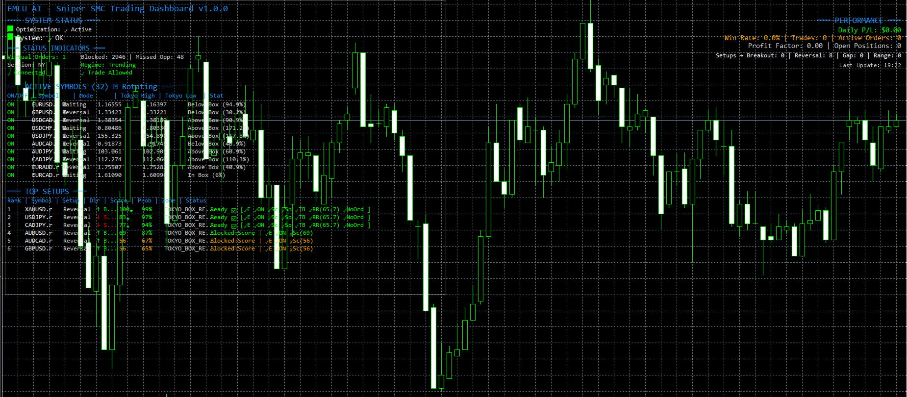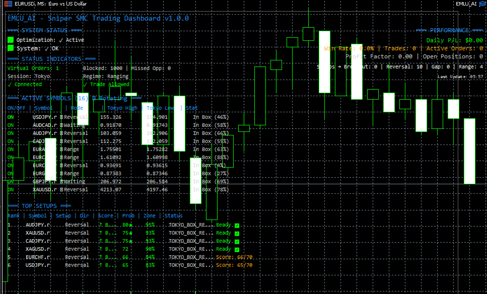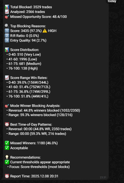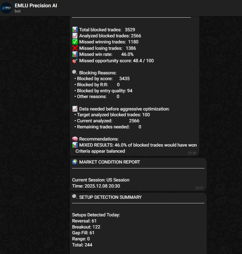 The system evaluates each setup through a multi‑factor scoring and validation pipeline before execution, with comprehensive diagnostics available for transparency.