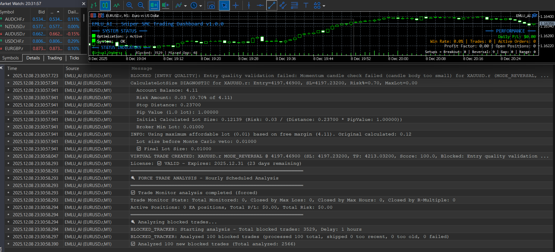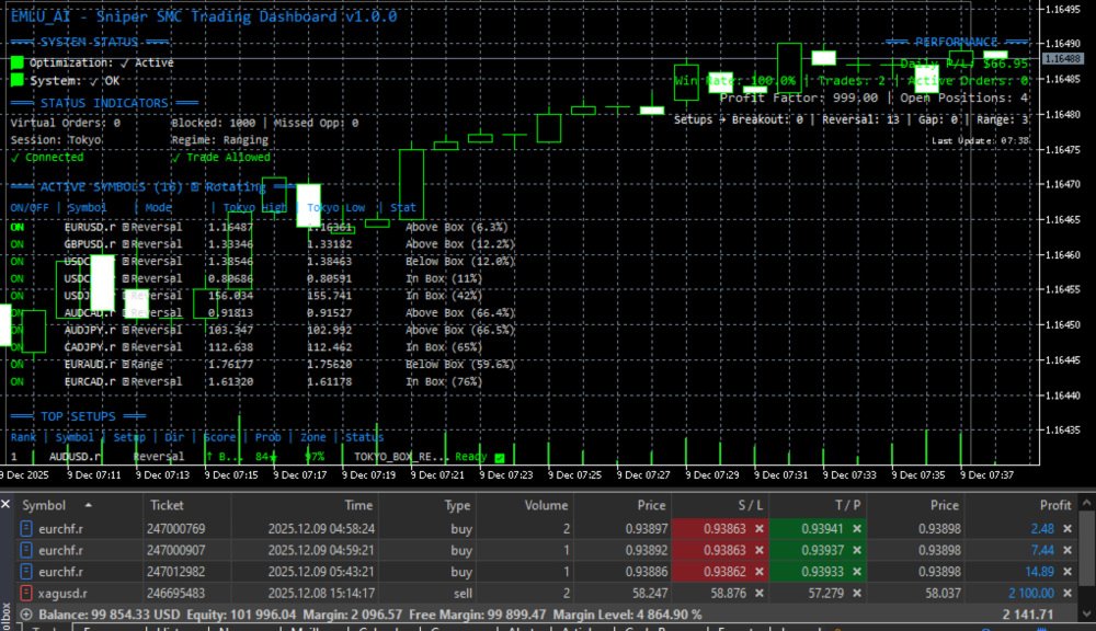 EMLU Precision AI is a rule‑based, multi‑layer algorithmic trading system designed for MT5. The EA focuses on risk‑aware trade selection, limit‑order precision, and structured exits across varying market regimes. The architecture is modular (OOP) and optimized for stable execution on both hedging and netting accounts.