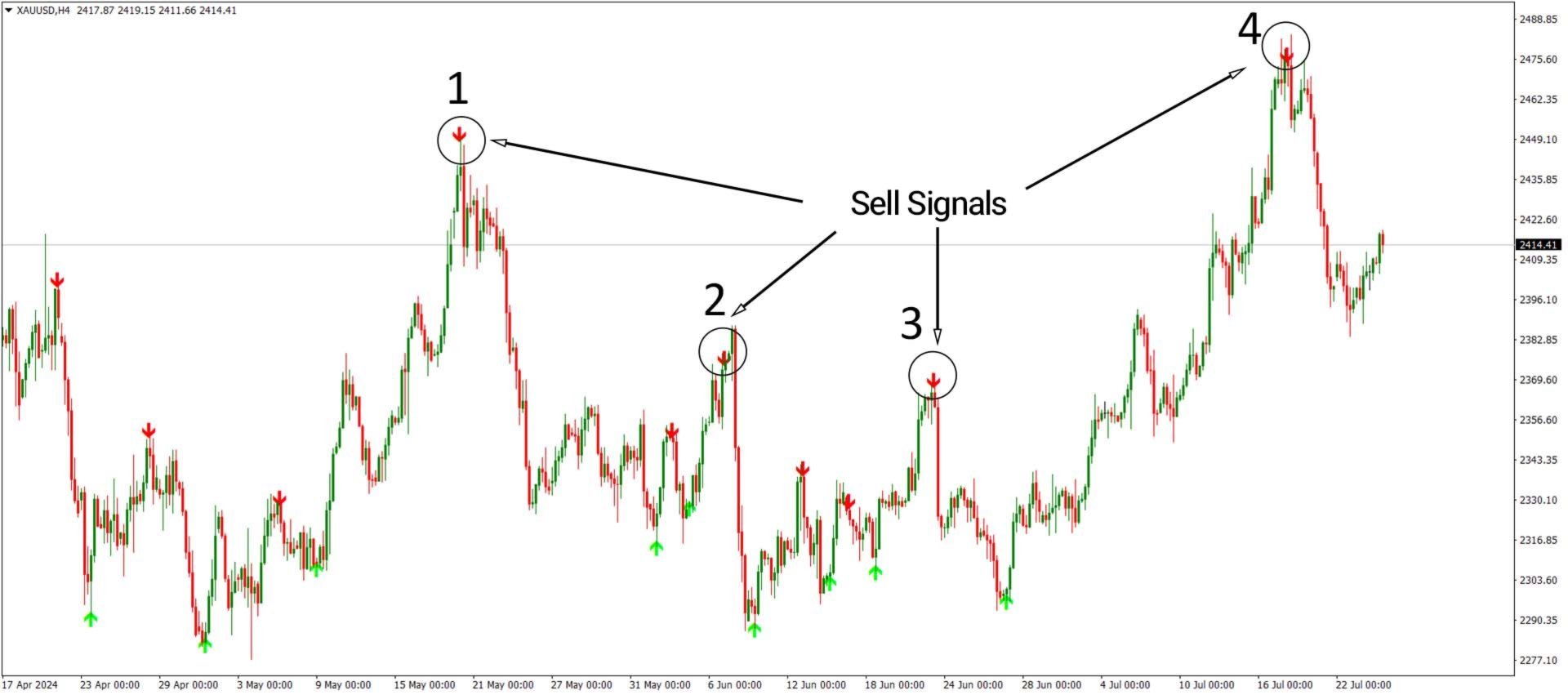 On the 4-hour gold chart (XAUUSD), the indicator marks pivot highs at points 1, 2, 3, and 4, issuing red arrows as sell signals. Adding support and resistance analysis can help validate these signals and strengthen confidence in trade entries.